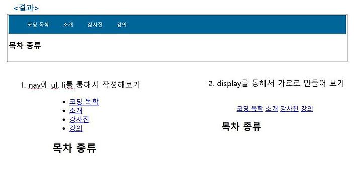 1 2 3 4 5 6 7 8 9 10 11 12 13 14 15 16 17 18 19 20 21 22 23 24 25 26 27 28 29 30 31 32 33 34 35 36 37 | <!DOCTYPE html> <html lang="en" dir="ltr"> <head> <meta charset="utf-8"> <title></title> <style media="screen"> nav{ width:100%; height:60px; background-color:#069; } nav ul li a { color: white; text-decoration: none; } nav>ul>li{ display:inline-block; margin: 20px; } </style> </head> <body> <nav> <ul> <li><a href="#">코딩 독학</a></li> <li><a href="#">소개</a></li> <li><a href="#">강사진</a></li> <li><a href="#">강의</a></li> </ul> <h2>목차 종류</h2> </nav> </body> </html> | cs |